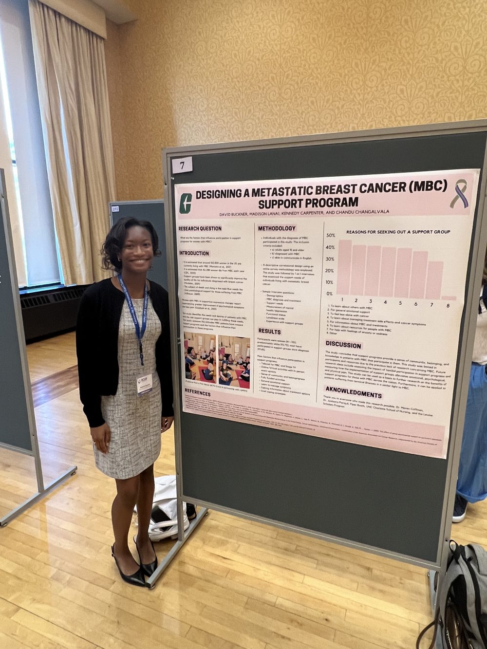 “He [David Buckner] was currently doing qualitative research with Dr. Maren Coffman, who was a graduate professor in the school of nursing. She just recently passed. But they were working to form a support group for women and individuals with Metastatic Breast Cancer since it is a very terminal illness. It was a very niche group that hadn’t been formed in Charlotte yet, and with us having the civic engagement project and having Carolina Breast Friends, which is a local nonprofit here. It was just, kind of, hitting the ground running with research and why it was needed. So David was like, these are the two things I need you to do. And I’m like, you know, why not? So I hopped on that research project very on, or very early on in August of my freshman year. We ended up going to Wisconsin around April to present this research at the National Conference of Undergraduate Researchers, and by that summer, our project proposal through Levine was approved.”